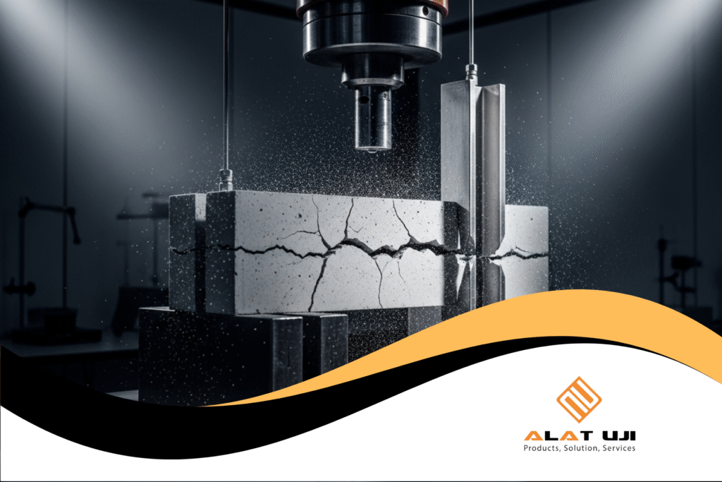 Uji tekan beton dengan mesin UTM menunjukkan retakan sampel.